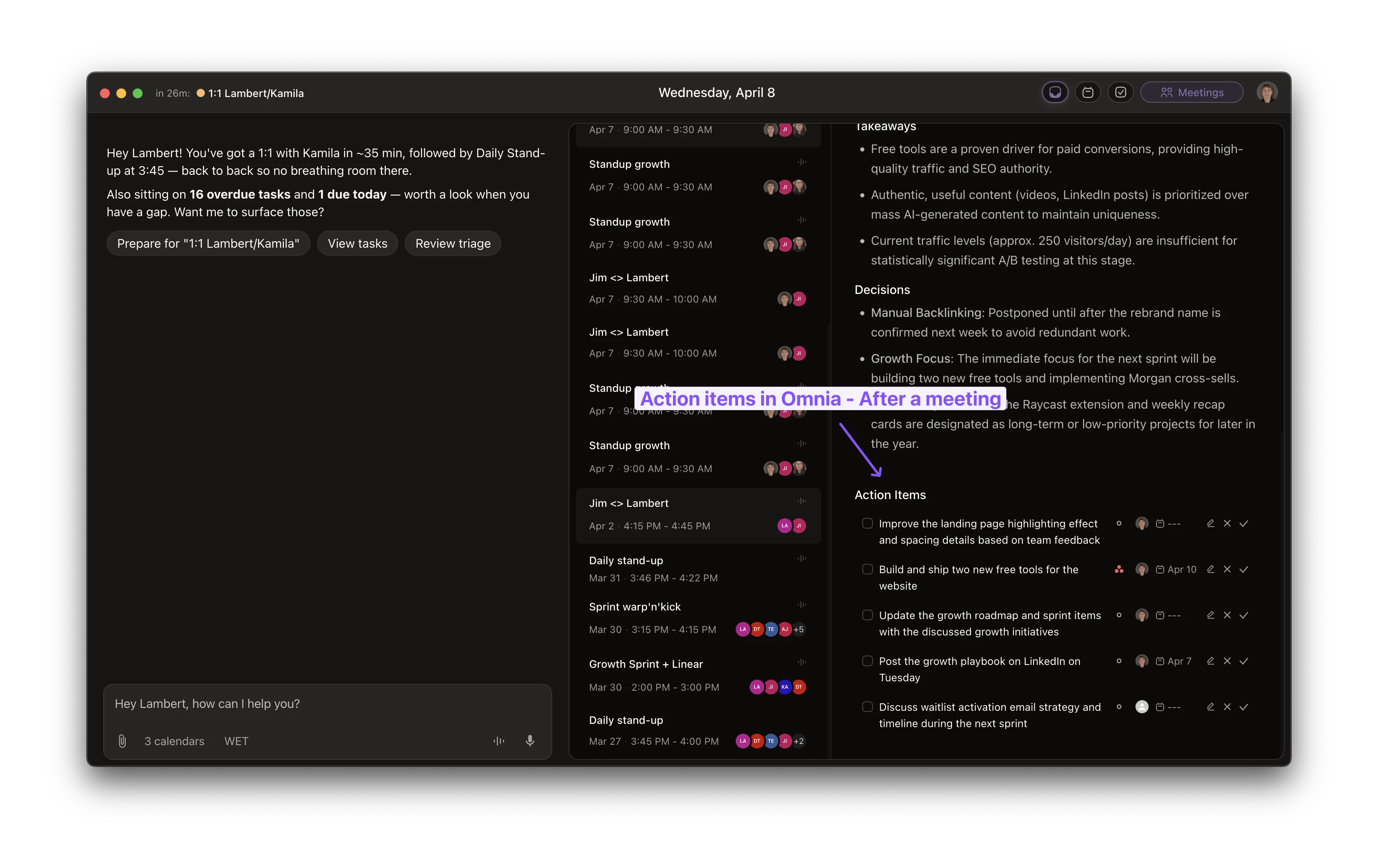 Kai is an AI executive assistant. It captures meetings botlessly, extracts action items with assignees and due dates, and routes them into your task system, your calendar and your inbox. Same idea as Granola's hybrid notes. But instead of producing a polished summary that lives in another app, it produces work that lands where work already happens. See the meeting action items workflow for how it actually chains through.