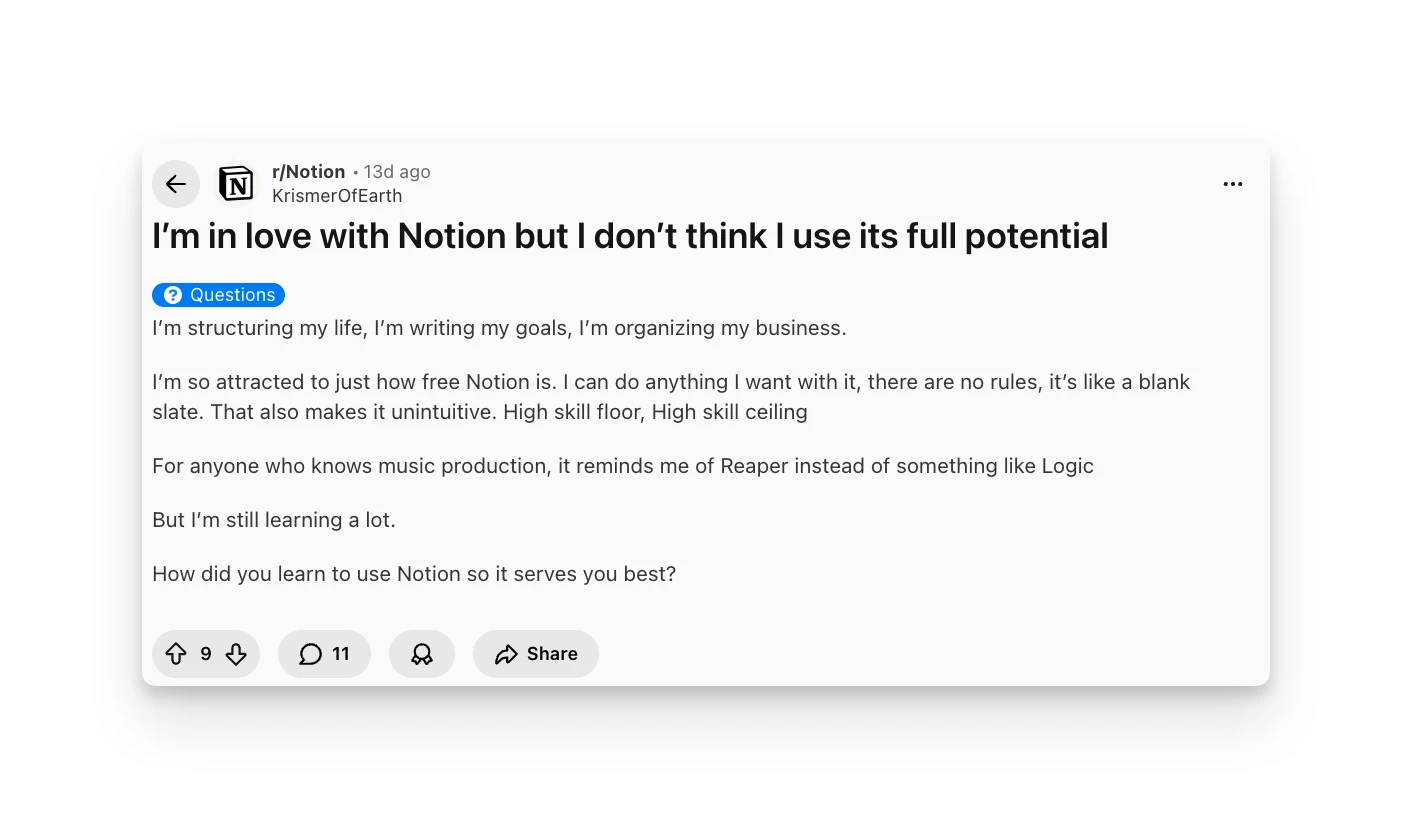 "I'm so attracted to just how free Notion is. I can do anything I want with it, there are no rules, it's like a blank slate." — Reddit review, 2026