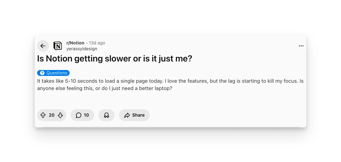 "It takes like 5-10 seconds to load a single page today. I love the features, but the lag is starting to kill my focus." — Reddit review, 2026