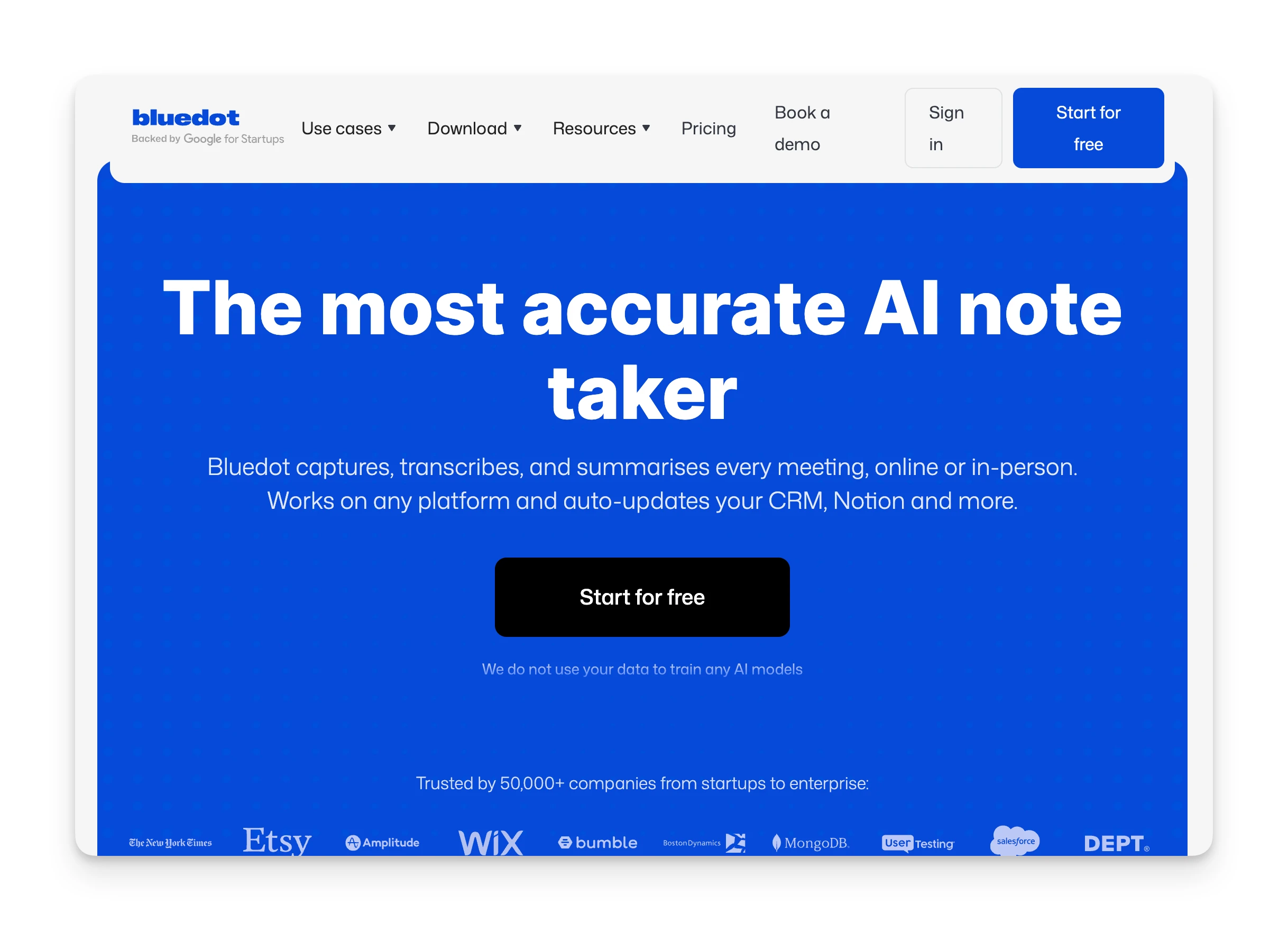 Bluedot combines bot-free recording with CRM integration. It's a Chrome extension that captures meetings without a visible participant, then syncs to HubSpot or Salesforce.