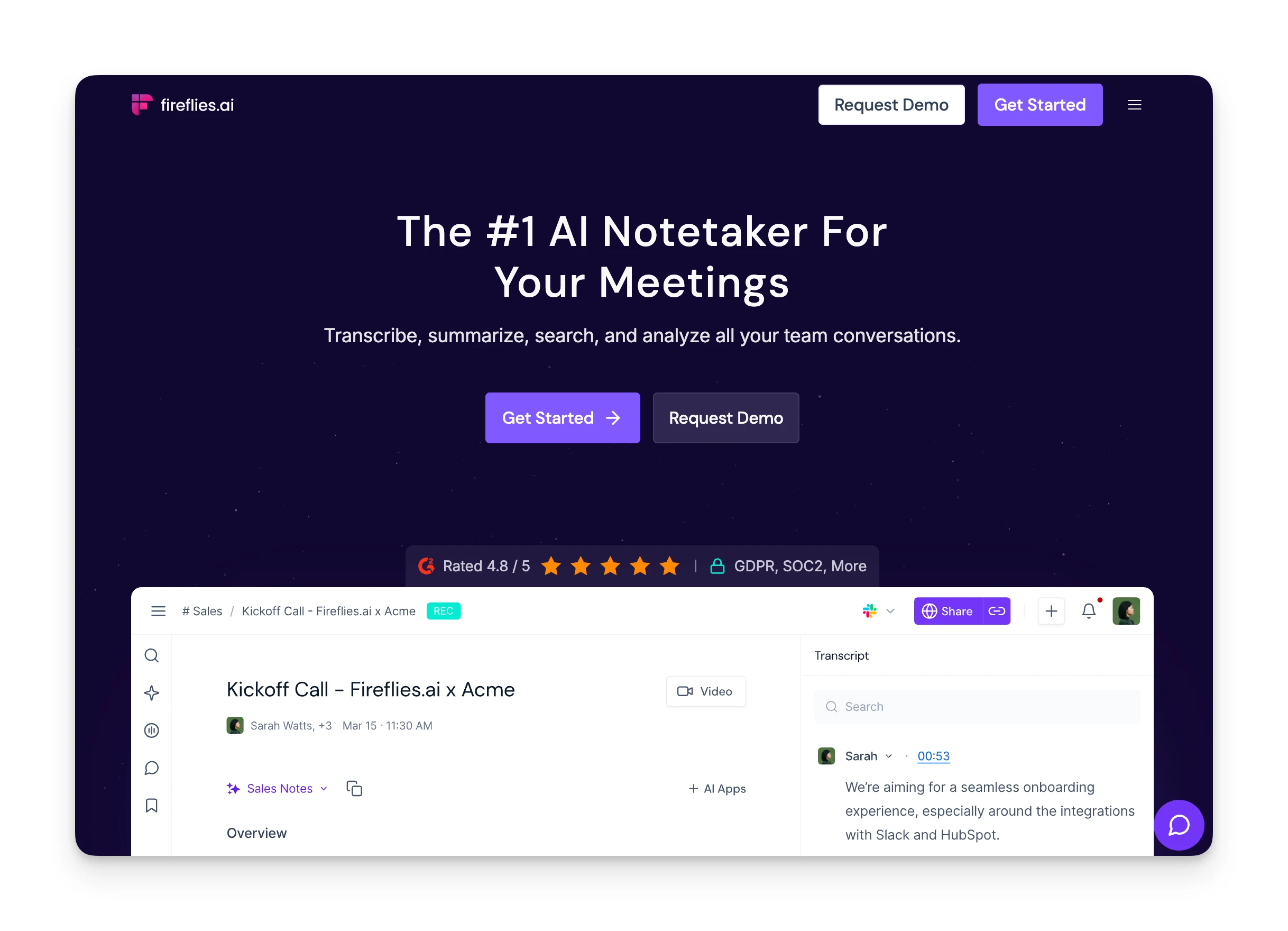Fireflies.ai is an AI meeting assistant built for teams that live in their CRM. It records, transcribes, and syncs meeting data directly to Salesforce and HubSpot.