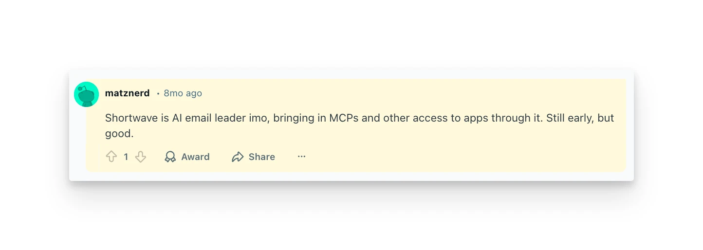 "Shortwave is AI email leader imo, bringing in MCPs and other access to apps through it. Still early, but good." — Reddit user, July 2025