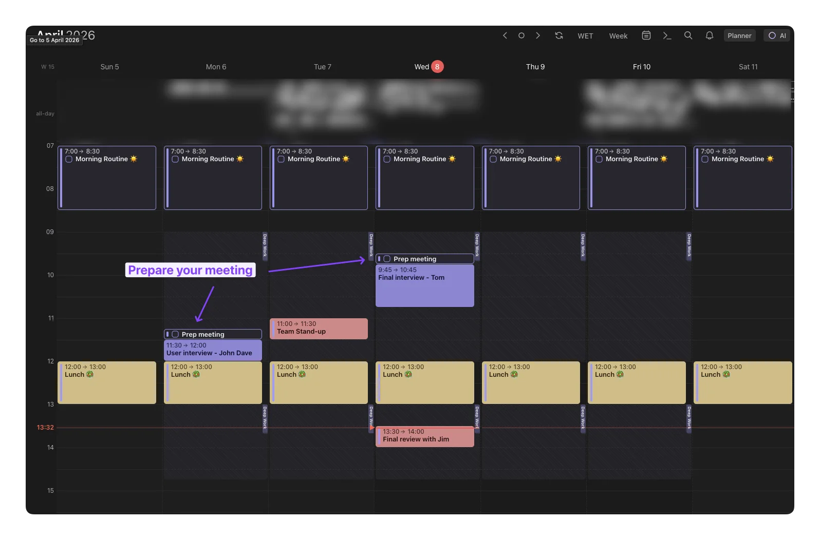 Small gotcha nobody mentions. Schedule the prep block at least 15 minutes before the meeting, not immediately before. If your prep ends at 2:00pm and your call starts at 2:00pm, you'll start the call still mid-thought. A 15-minute buffer is the difference between "I'm ready" and "give me one second I'm pulling something up".