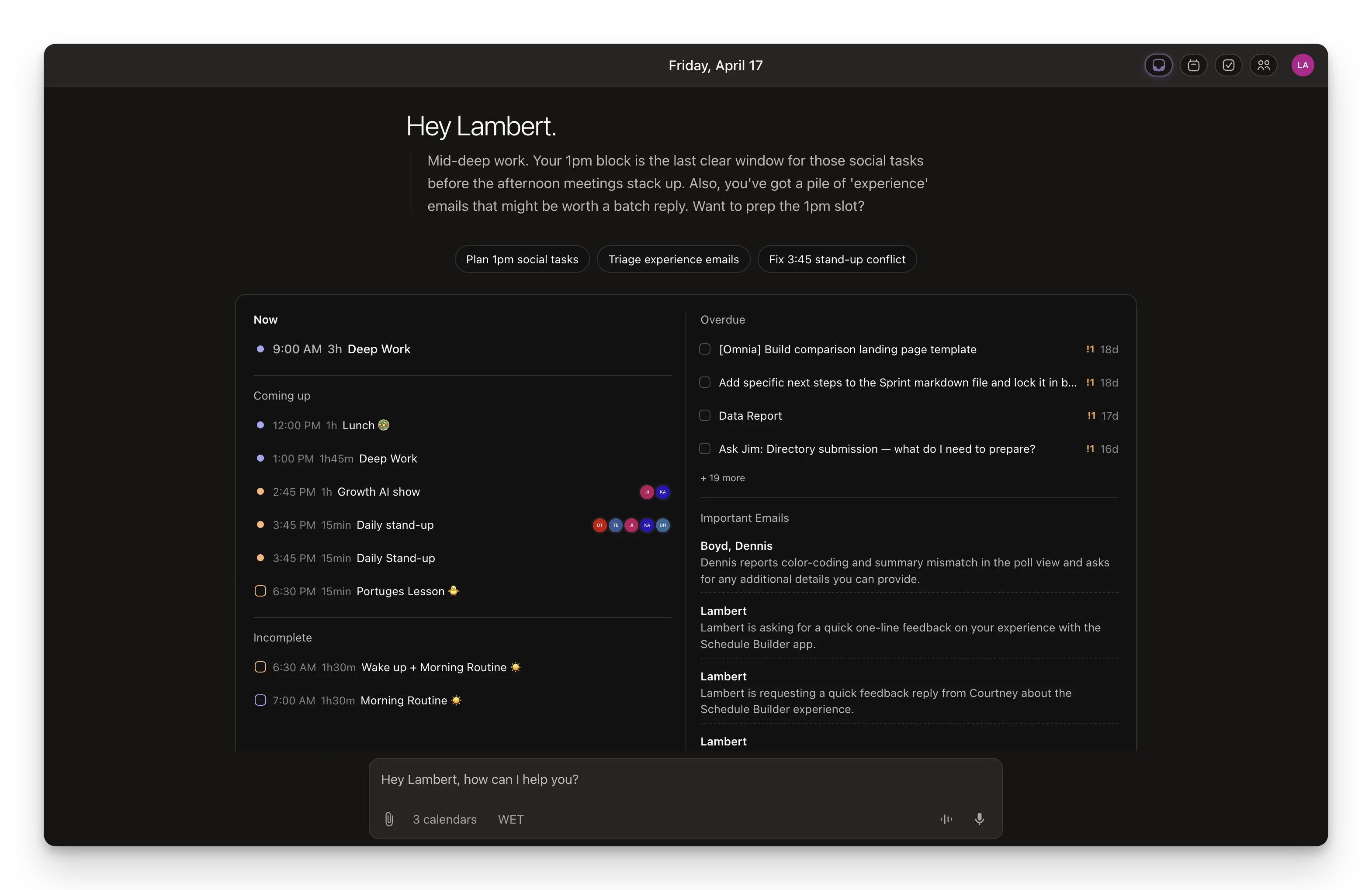 The algorithm considers over 1,000 parameters: deadlines, dependencies between tasks, your preferred work hours, meeting buffers, and existing commitments. It re-optimizes throughout the day without you lifting a finger.