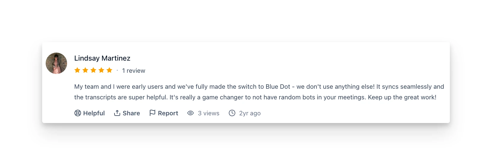 "My team and I were early users and we've fully made the switch to Blue Dot. It's really helpful to not have random bots in your meetings." — Product Hunt review
