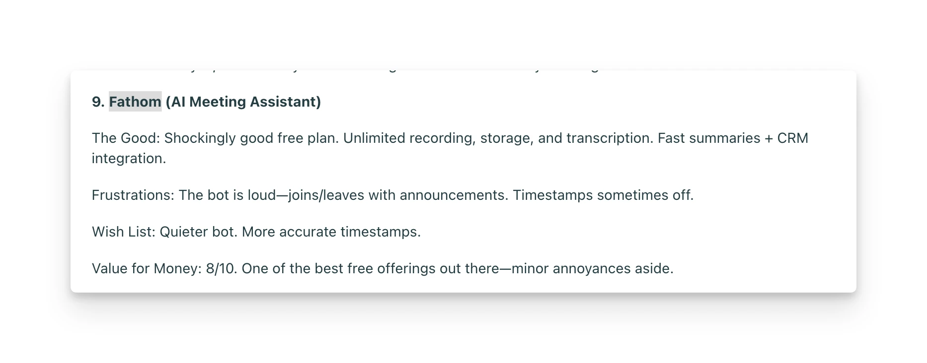 For teams that just need free unlimited recordings and don't mind a visible bot, Fathom is a solid choice. For sales teams prioritizing CRM integration over discretion, Fireflies delivers.