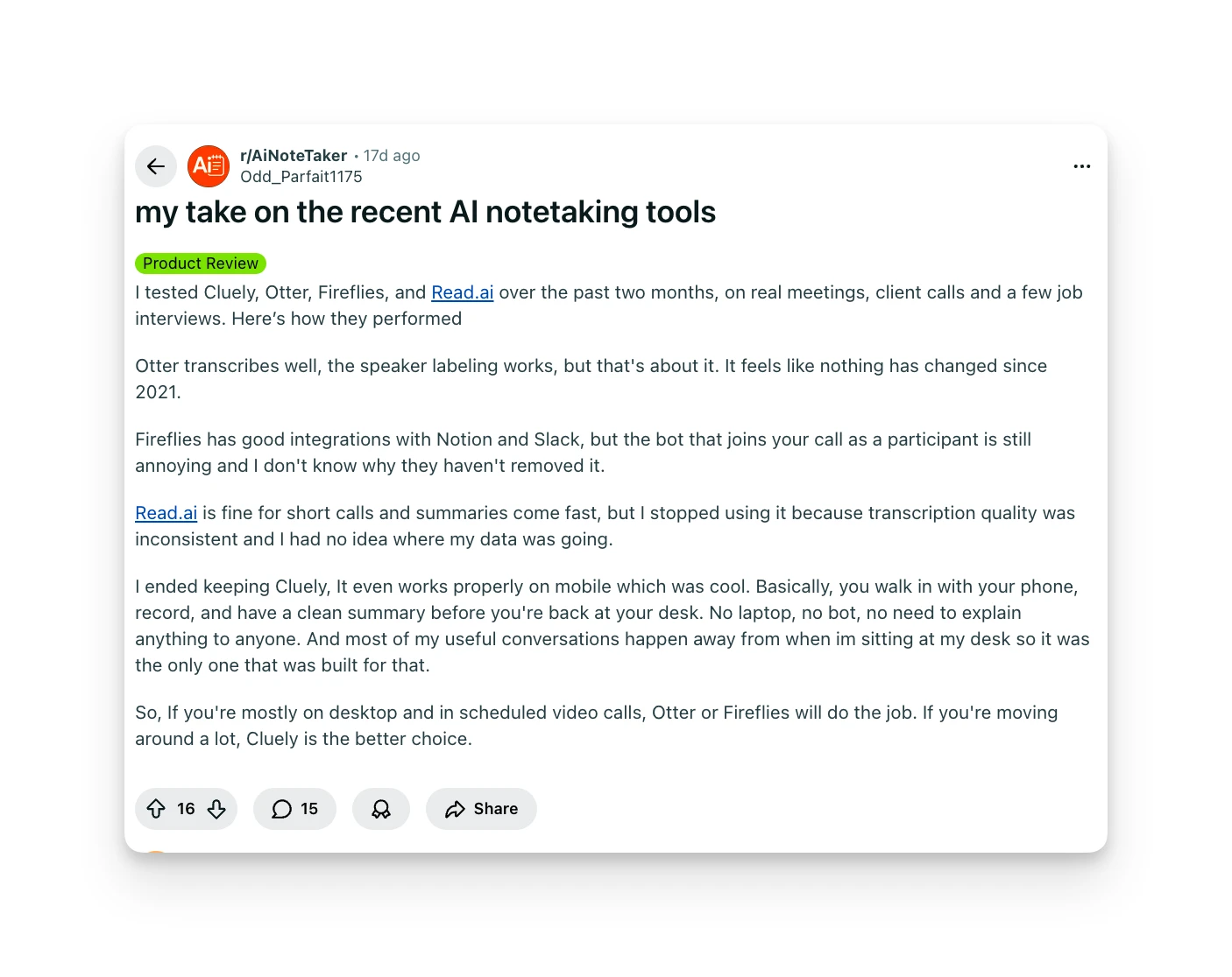 "Shockingly good free plan. Unlimited recording, storage, and transcription. Fast summaries + CRM integration.The bot is loud—joins/leaves with announcements. Timestamps sometimes off." — Reddit user, r/AiNoteTaker