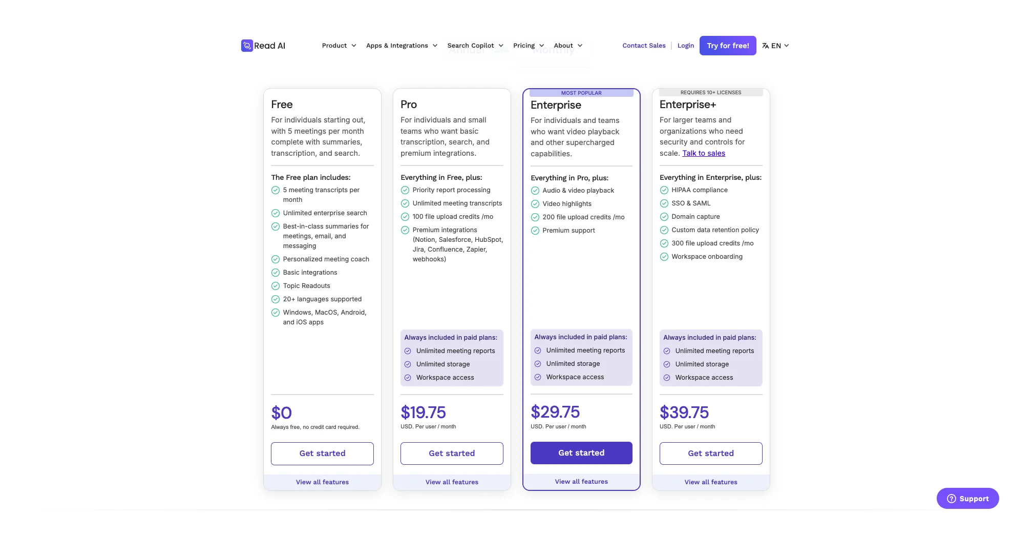 As of April 2026, Pro is $15/user/month annual ($19.75 monthly). Enterprise is $22.50/user/month annual ($29.75 monthly). Enterprise+ is $29.75/user/month annual ($39.75 monthly), 10-license minimum. Verified at read.ai/pricing.