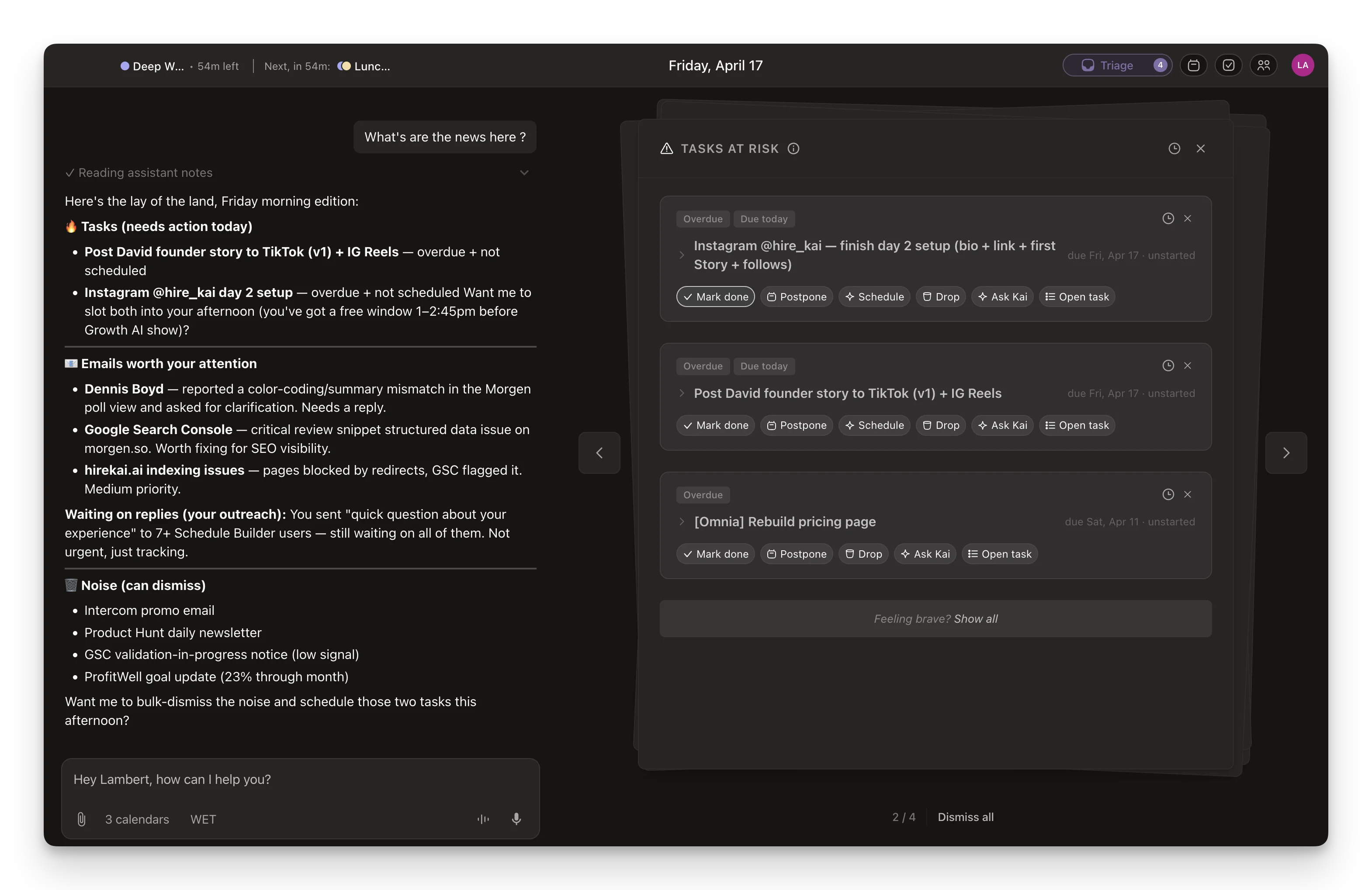 - Kai: Best for knowledge workers who want AI email triage, meeting intelligence, and task management in one assistant. Drafts ready before you open your inbox.